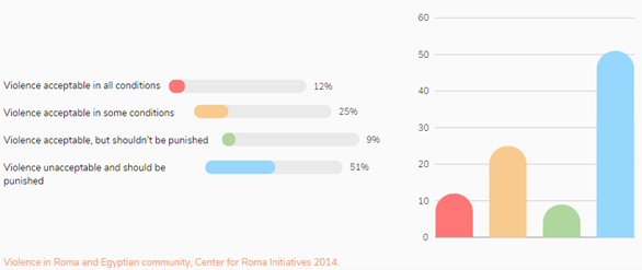 However, this problem doesn’t occur only in underage marriages. Violence is connected with long-term discrimination against women. According to attitude research on the Roma population by the Center for Roma Initiatives (CRI), respondents think that it is okay to hit a woman – if she deserves it.